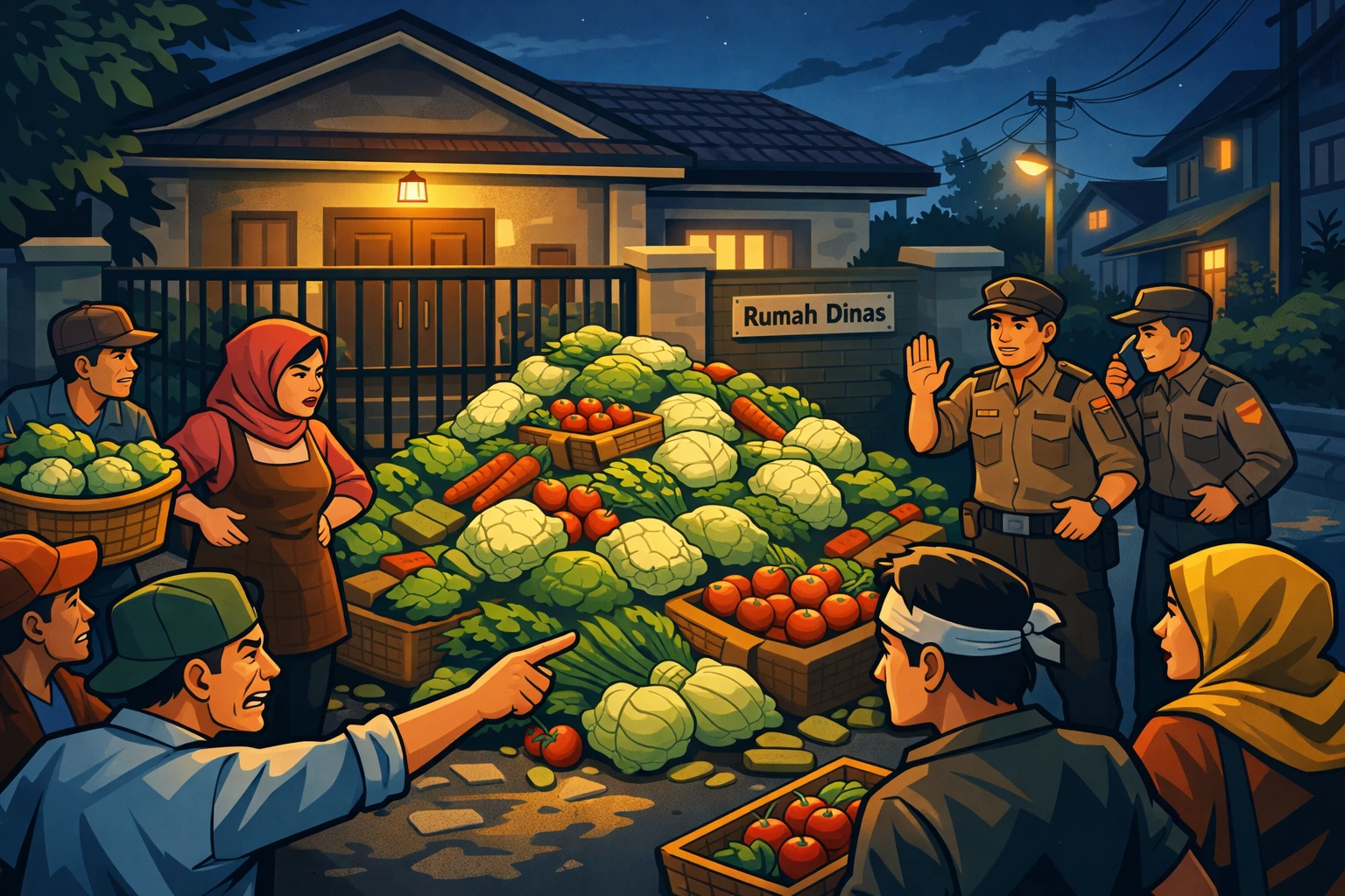 Cerita ini langsung bikin warga sekitar heboh. Tumpukan kol, sawi, sampai tomat terlihat menggunung di depan rumah camat. Situasi sempat tegang, tapi aparat bergerak cepat.