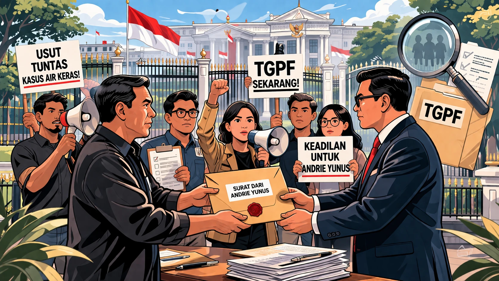 Di tengah suasana yang cukup tegang tapi tetap kondusif, surat tersebut bahkan sempat dibacakan langsung di lokasi. Isinya nggak bertele-tele—Andrie secara tegas meminta negara membentuk Tim Gabungan Pencari Fakta (TGPF) untuk mengusut kasus penyiraman air keras yang menimpanya.